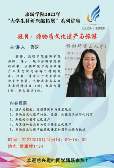为丰富公司同学们学习生活,活跃同学们科研学术氛围、提高同学们学术活动的兴趣和积极性,从本学期开始,betway西汉姆官网科研办和团委联合举办“老员工科研拓展”活动系列讲座。2022年10月14日下午14:00-16:00公司举办第一次讲座,讲座邀请公司科研办鲁芬老师跟同学们分享“非物质文化遗产与旅游”话题。
