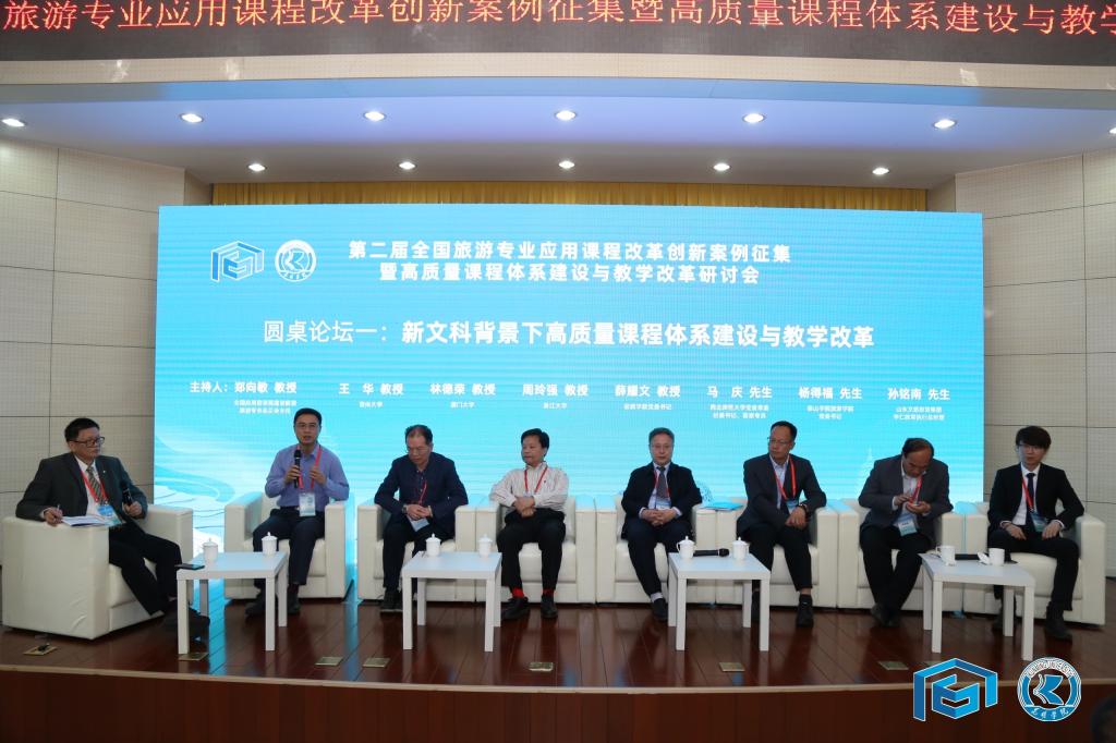 第二环节:圆桌论坛。第一场围绕新文科背景下高质量课程体系建设与教学改革展开,由华侨大学郑向敏教授主持,来自浙江大学的周玲强教授、厦门大学林德荣教授、暨南大学王华教授、西北师范大学马庆教授、运城公司经理薛耀文教授、泰山公司杨得福教授和山东文旅投资集团华仁教育执行总经理孙铭南先生参与研讨,在新文科背景下,旅游学科高质量课程体系建设与教学改革应坚持多学科交叉融合、协同发展、集成创新等方面达成共识。
