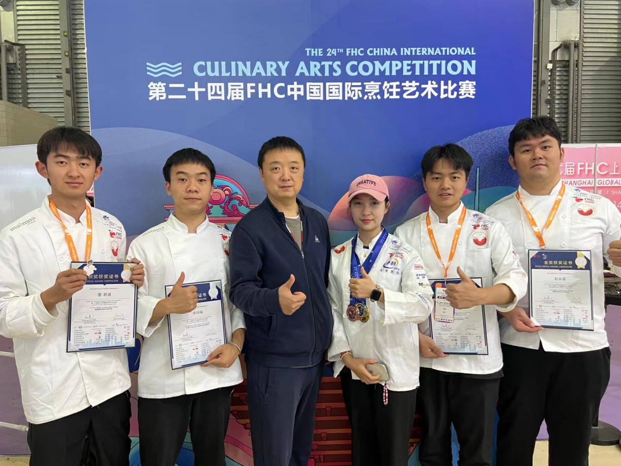 在王勇老师和马立萍老师指导下,betway西汉姆官网师生在11月10日结束的第二十四届FHC中国国际烹饪艺术比赛中取得令人瞩目的成绩。赵永嘉同学勇夺一枚金牌和一枚铜牌,徐国瑞同学获得一枚银牌,马肖和张世通同学分别获得三枚铜牌。这些同学们的出色表现不仅赢得荣誉,更赢得人们的赞誉和尊重。