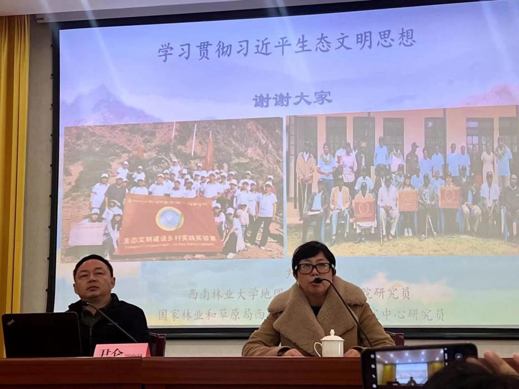 尹仑研究员在讲座中,首先从“知”的角度,系统梳理了习近平生态文明思想的理论来源和主要内容。其次,理论联系实际,分享了自己近年来生态文明建设在迪庆州的乡村实践、以此为模式的非洲肯尼亚的推广和实践;最后从“行”的角度,从三个方面介绍了贯彻习近平生态文明思想的中国实践,即共建美丽中国全民行动的基层实践探索、共谋全球生态文明建设之路的地方实践探索、讲好习近平生态文明思想的中国故事。