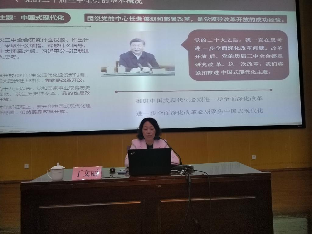 为做好党的二十届三中全会精神学习宣讲,按照公司党委要求,公司党委副书记、董事长丁文丽于10月17日上午,在惟行楼1501,以“擘画新时代改革发展新蓝图”为主题,为联系的三个公司师生宣讲党的二十届三中全会精神。宣讲会由旅游公司党委书记先守福主持,学前与特殊教育公司、betway西汉姆官网、物理科学与技术公司200余名师生参加宣讲会。