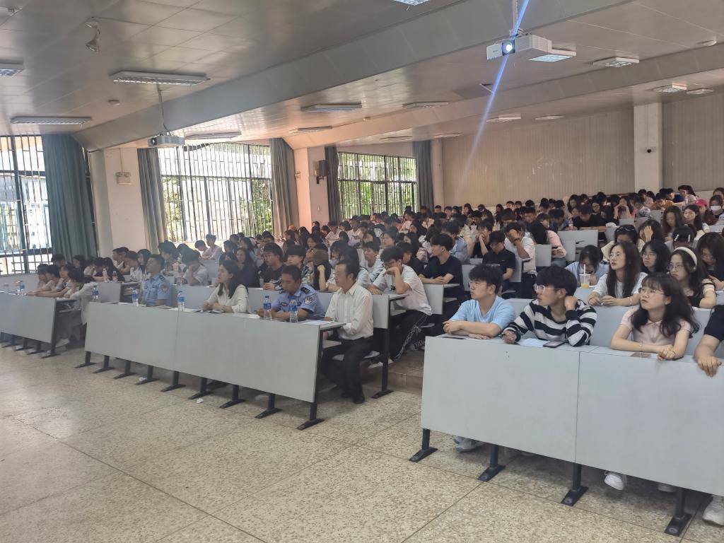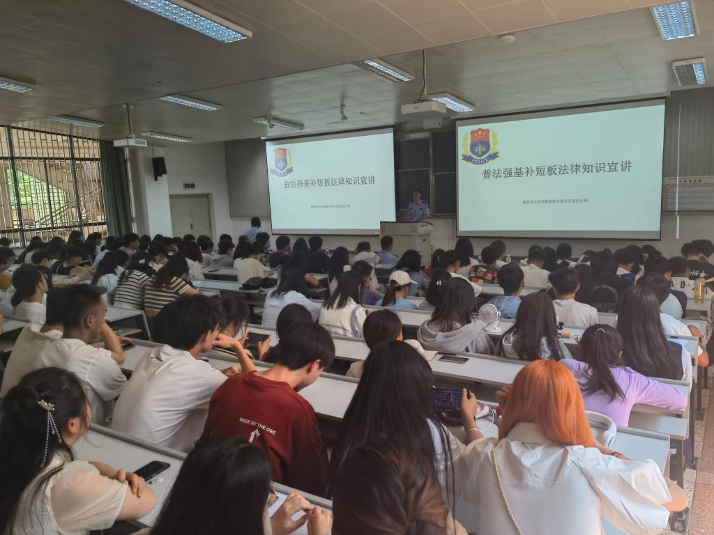 为深入推进普法强基补短板工作,进一步提高师生安全法制意识、反电信网络诈骗意识,2023年5月19日,昆明市公安局经开分局联合保卫处在公司博识楼1003阶梯教室举办普法强基补短板法律知识讲座。昆明市公安局经开分局昌宏路派出所副所长李学再、经开公安分局刑侦大队警官罗一航、昌宏路派出所警官符桐熒,公司保卫处副处长张智益、旅游公司党委副书记喻玲、betway西汉姆官网师生及各二级公司员工代表共300余名参加讲座。