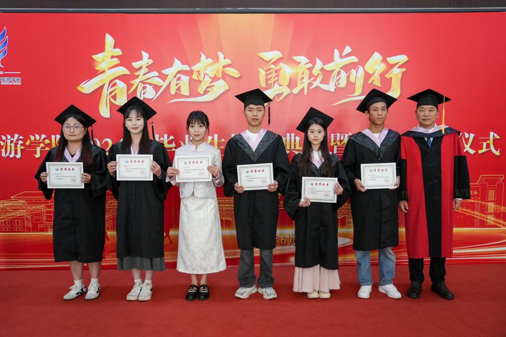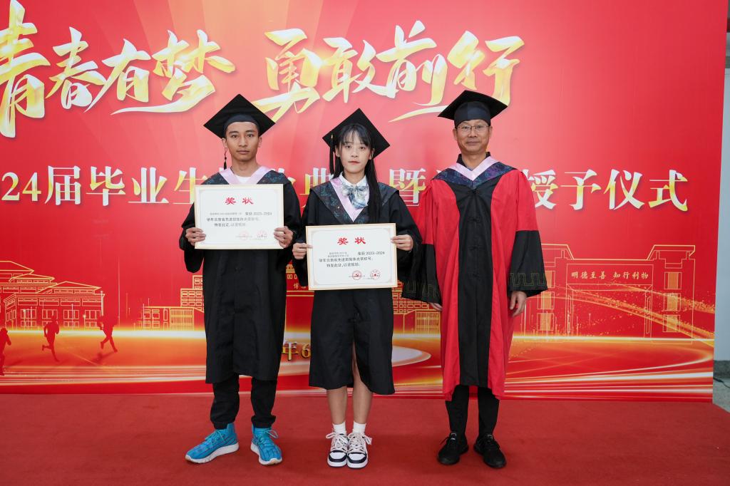 党委书记先守福宣读了2024届省级三好生、省级优秀员工干部、校级优秀毕业生、省级优秀毕业生、省级先进班集体表彰决定,副经理杨韫宣读考研升学“学习标兵”名单,公司领导为获奖毕业生代表颁奖。