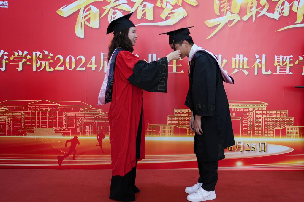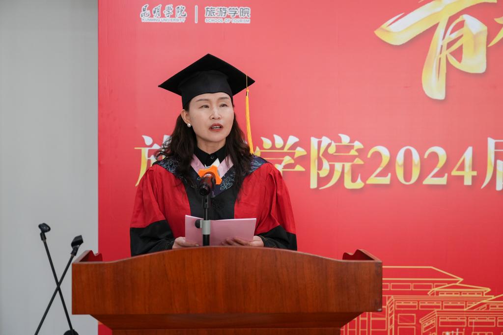 副经理孙志强宣读学位授予情况,田芙蓉为毕业生代表颁发学位证书、拨苏正冠。