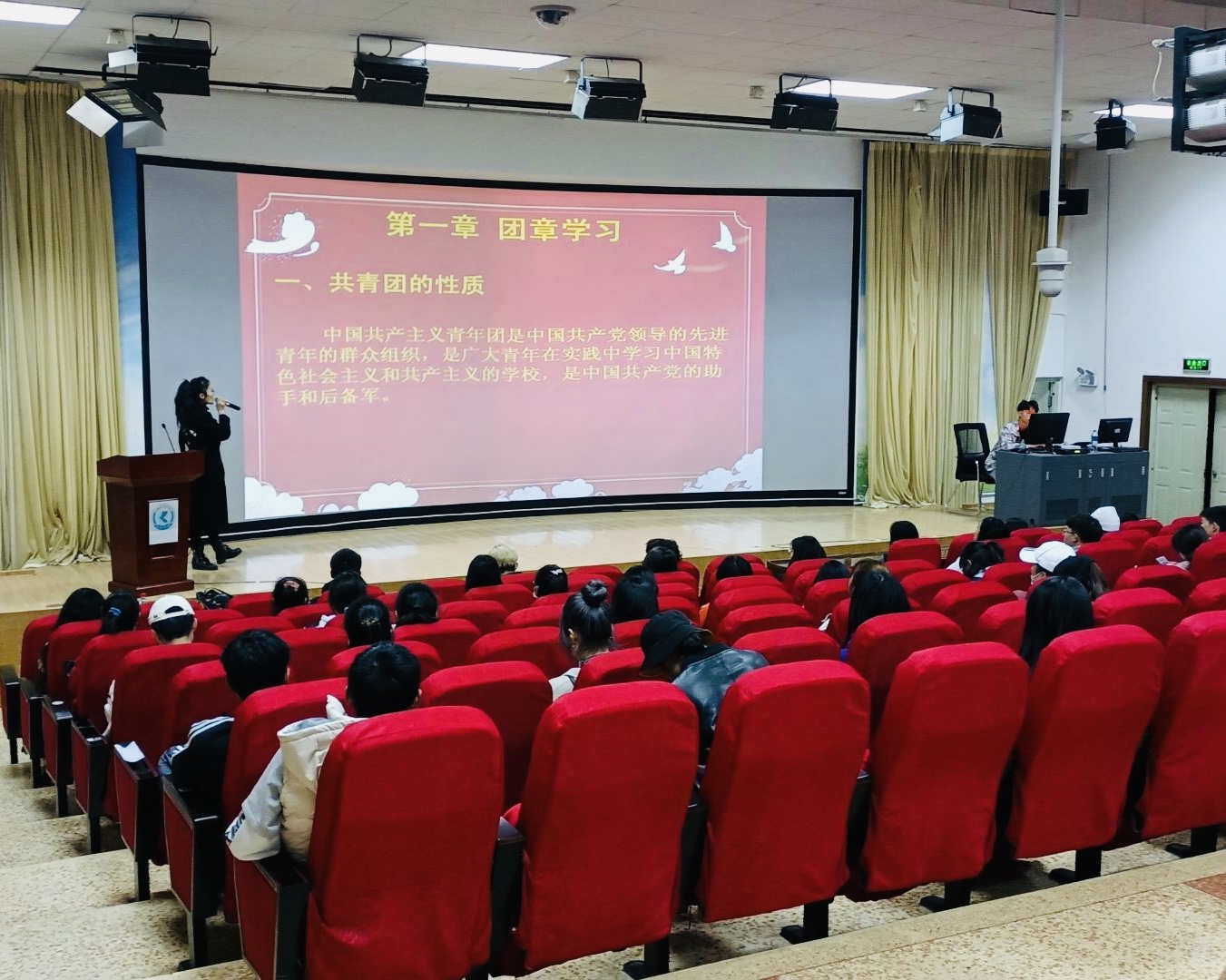随后,荣杨老师带领所有学员重温《团章》,从团章概述、团章总则及学习和遵守团章三方面入手,详细讲授了团章的主要内容、团员的权利与义务、团的组织领导等方面知识。同时,结合当下时事热点,要求同学们严格学习和遵守团章、遵守校级校规,保持生机与活力,争做先进青年。