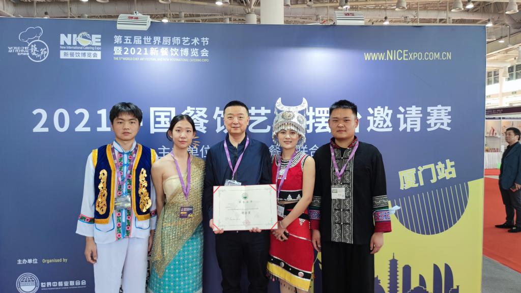 2021年12月12—13日,“第五届世界厨师艺术节暨2021新餐饮博览会”在厦门举办。betway西汉姆官网田芙蓉经理、孙志强副经理亲自带队到厦门国际会展中心参加2021中国餐饮艺术摆台邀请赛。本次艺术摆台邀请赛特色鲜明,创意独特,为2021新餐饮博览会增添了靓丽风景。betway西汉姆官网的《滇之韵》,以云南的食材和味道为基础,呈现生物和食物的多样性,通过不同的烹饪方法,把云南美味表现出来,充分展现了“人与自然和谐共生”的美好愿望。