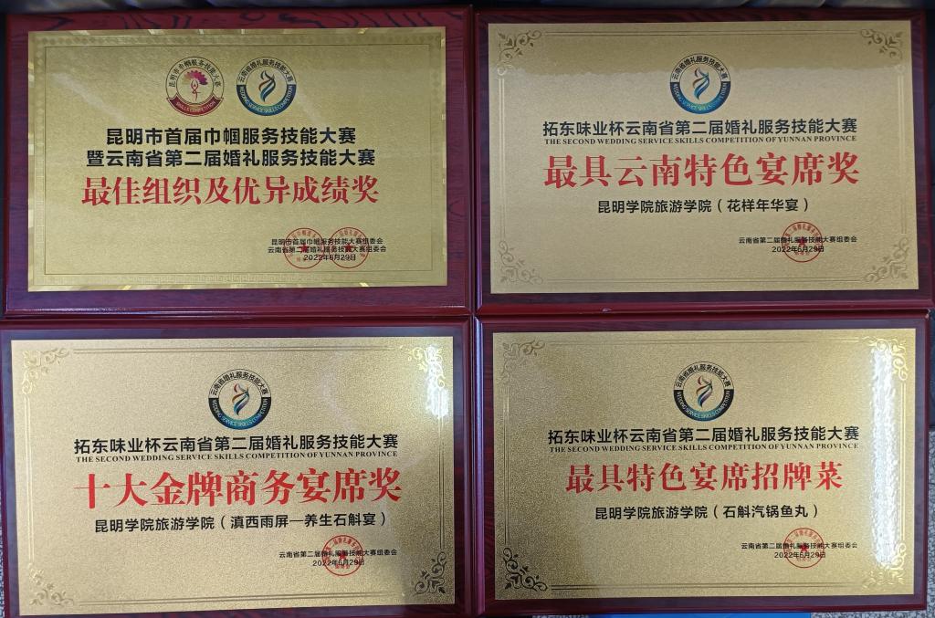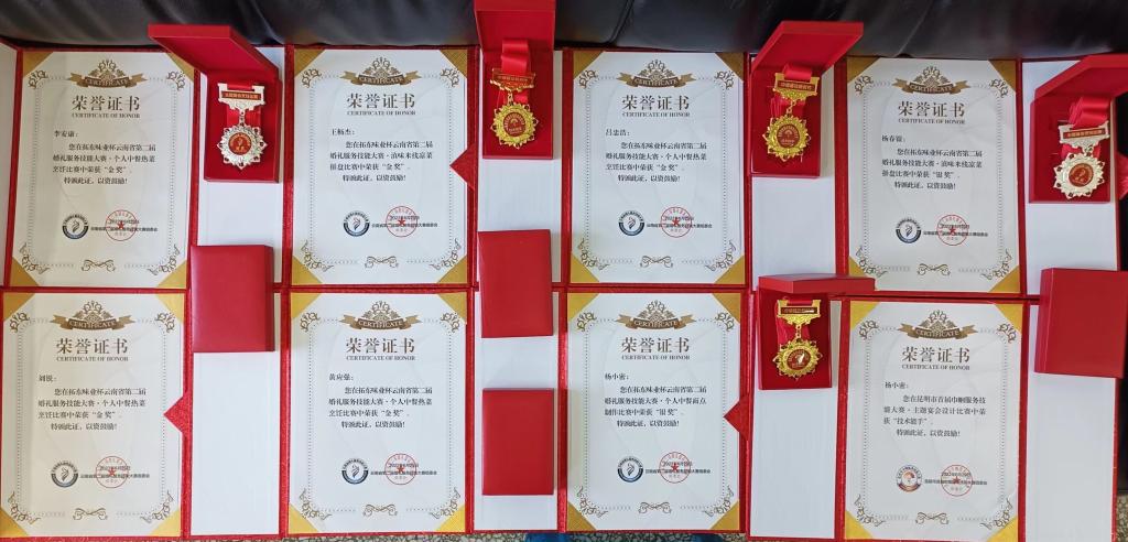 通过公平公正的裁判,大赛评选出各个项目的金奖、银奖、铜奖,betway西汉姆官网参赛选手荣获6金2银、十大金牌商务宴席奖、最具云南特色宴席奖、最佳组织及优异成绩奖等奖项。betway西汉姆官网参赛女选手杨小密、张晓琴、张怀萍同时被授予“巾帼服务技能大赛优秀技术能手”荣誉称号。