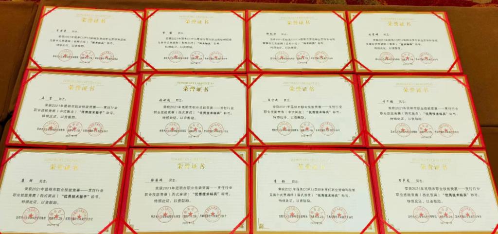 2022年8月9日,昆明市餐饮与美食行业协会年度盛典暨2021年昆明地区烹饪技能竞赛颁奖大会在昆明市西山区云安会都隆重举行。betway西汉姆官网王勇、刘福灿两位教师指导的员工马肖、张世通同学荣获优秀技术能手,李钰、付千禧、徐国瑞、夏宁武、刀声龙同学荣获优秀技术标兵,刘贵明、李安康、李露、徐林源荣获技术标兵等荣誉称号。同时,betway西汉姆官网烹饪与营养教育专业康烨老师荣获优秀技术能手荣誉称号。刘福灿老师被昆明市餐饮与美食行业协会名厨专业委员会聘为秘书长。