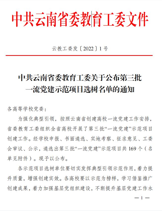 近日,云南省委教育工委发文,公布云南省委教育工委第三批一流党建示范项目选树名单,公司员工第三党支部被云南省委教育工委选树为第三批示范党支部。