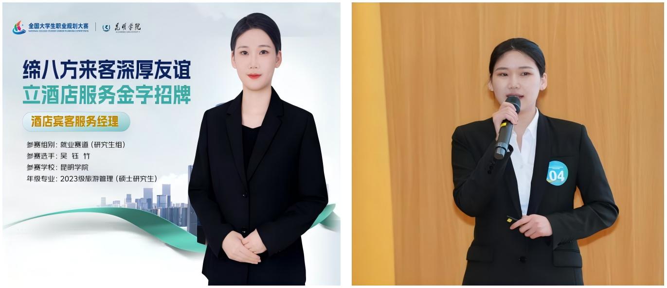 本次大赛以“筑梦青春志在四方,规划启航职引未来”为主题,全面考察选手的职业目标定位、职业规划能力和综合应变素质。吴钰竹同学以酒店服务经理这个职业岗位为核心,立足酒店管理专业,结合个人优势以及社会发展需求,构建了职业酒店经理人的发展路径,其职业规划方案获得评委高度评价,充分展现了旅游专业青年的职业风采。