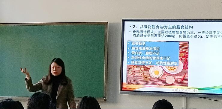 近年来,社会出现很多营养性疾病,如肥胖、糖尿病、高血压、高血脂、冠心病等。从人群结构看,全国超七成老员工有减肥经历,近五成员工减肥失败,美食诱惑、不喜欢运动是减肥失败的主要原因,超五成老员工没有制定减肥计划,超七成减肥失败者没有按照减肥计划进行。减肥属于以减少人体过度的脂肪、体重为目的的行为方式,需要科学指导。科学减肥要遵循“稳扎稳打、营养不减”的总原则,通过运动和饮食等方式,纠正造成肥胖不合理的饮食习惯和作息时间以及少量的运动。伍欣老师为同学们介绍了科学的膳食类型:动植物食物平衡的膳食结构、以植物性食物为主的膳食结构、以动物性食物为主的膳食结构、地中海膳食结构。
